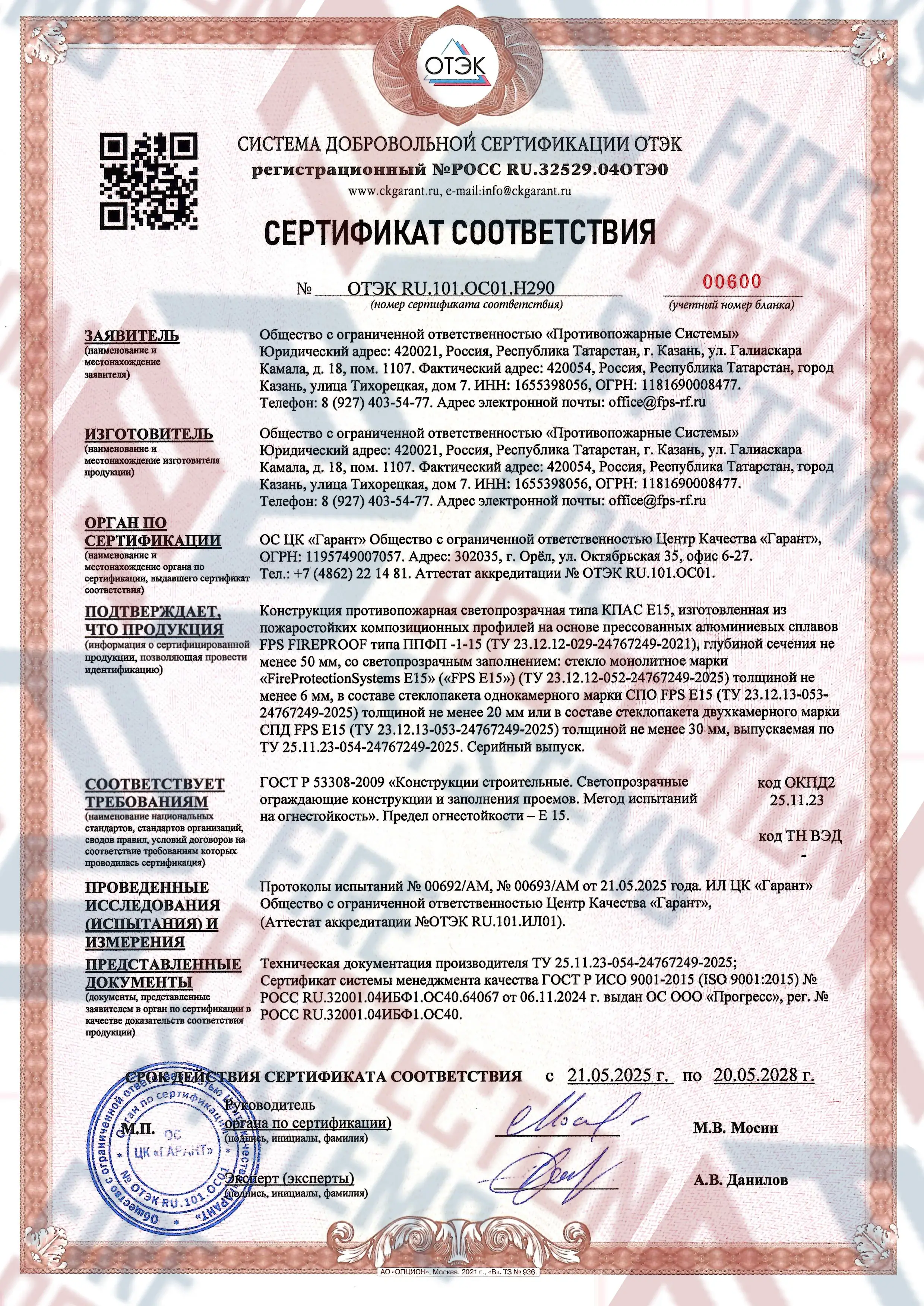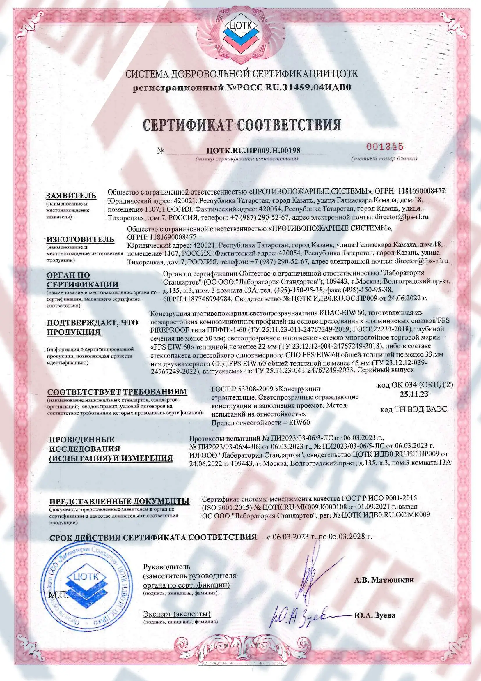 Повышенная огнестойкость (EIW 60) — эффективно сдерживают пламя, дым и тепловое излучение в течение 60 минут.